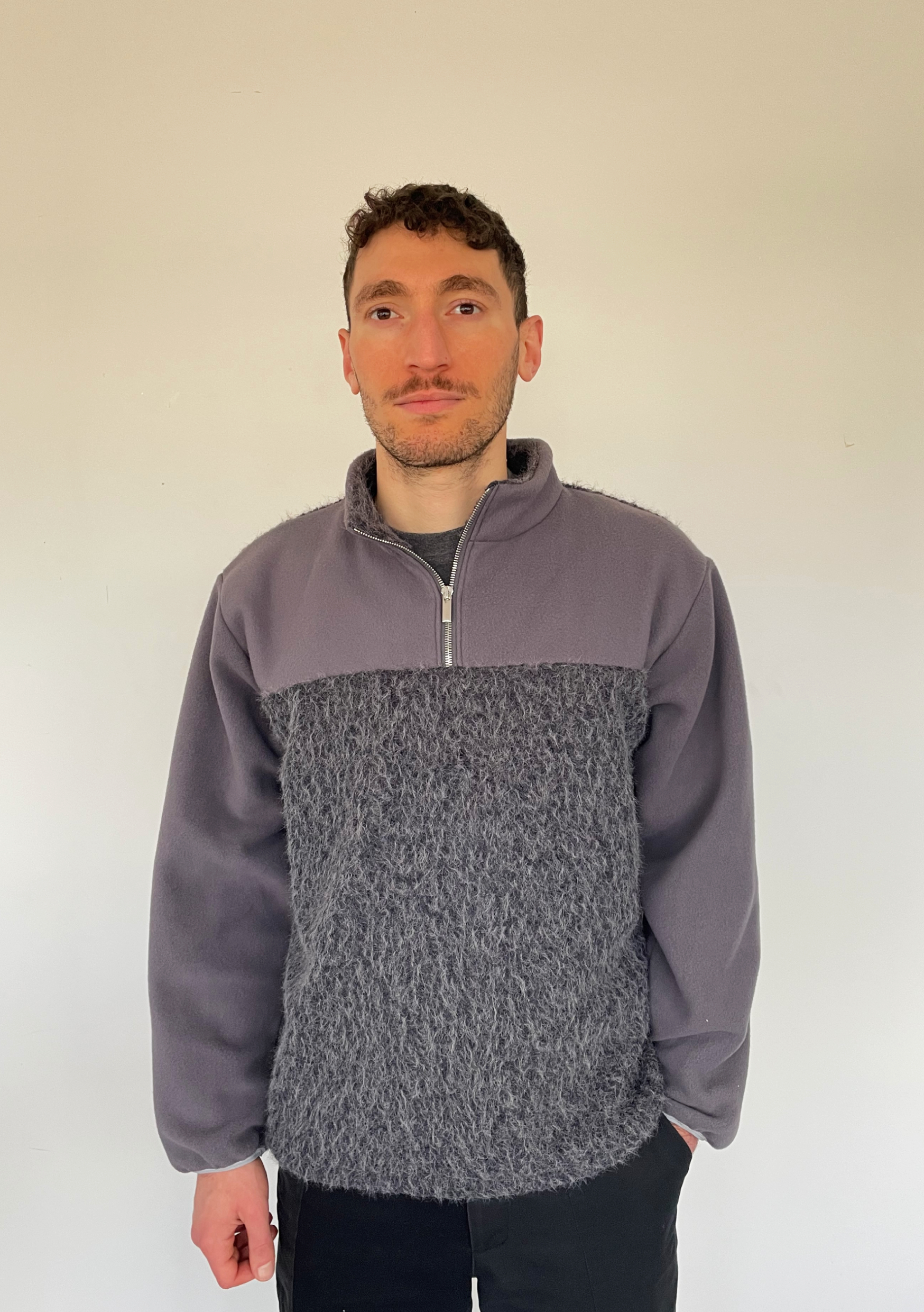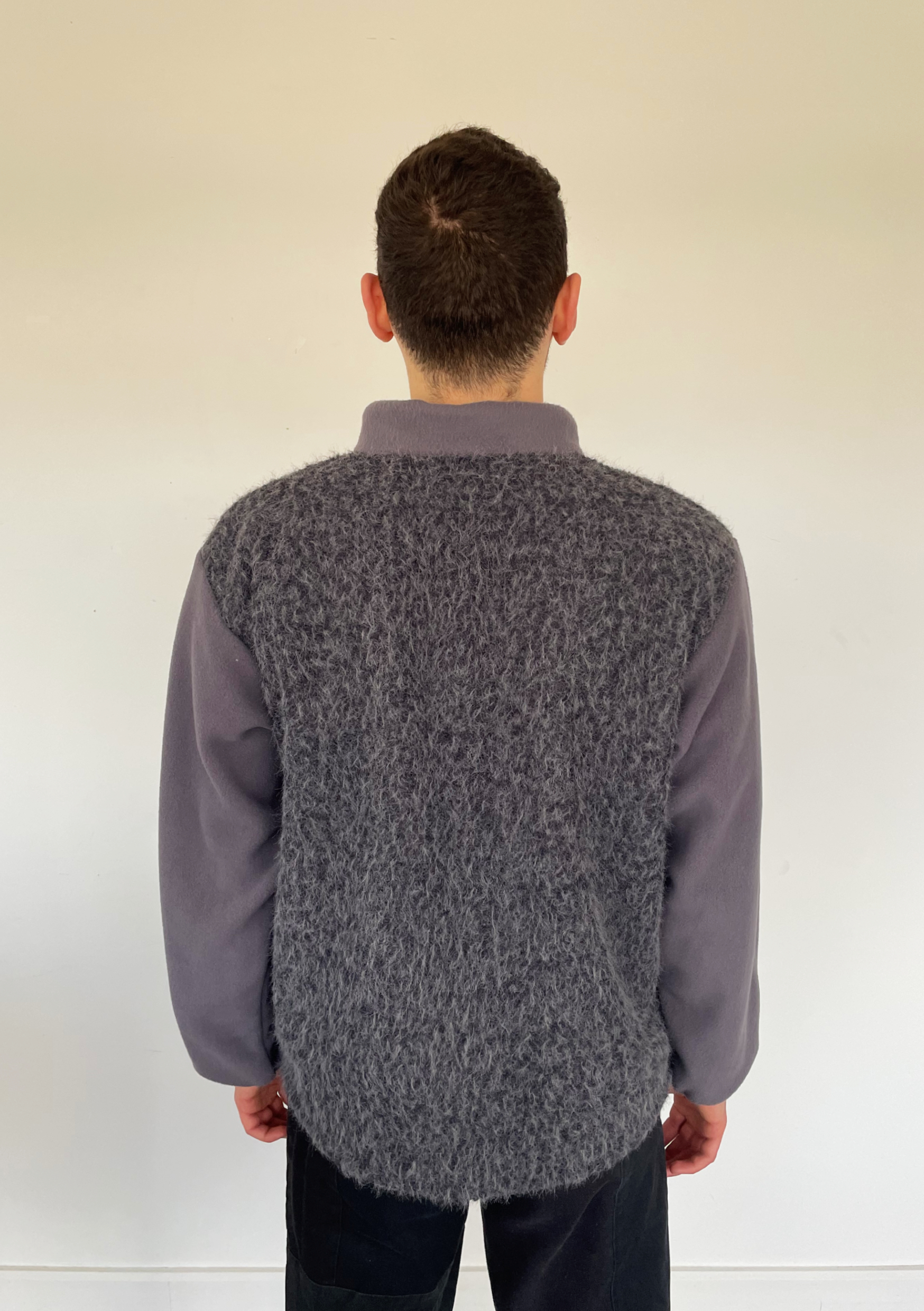 Polaire composée de sherpa (faux mouton) blanc et de lainage bouclette, parfait pour les froides journées d’hiver ! Zippée au col, bas de manches resserré par un élastique. Etiquette avec le logo de la marque cousu sur le côté de la polaire. Tissus issus de stocks dormants de maisons de couture françaises.