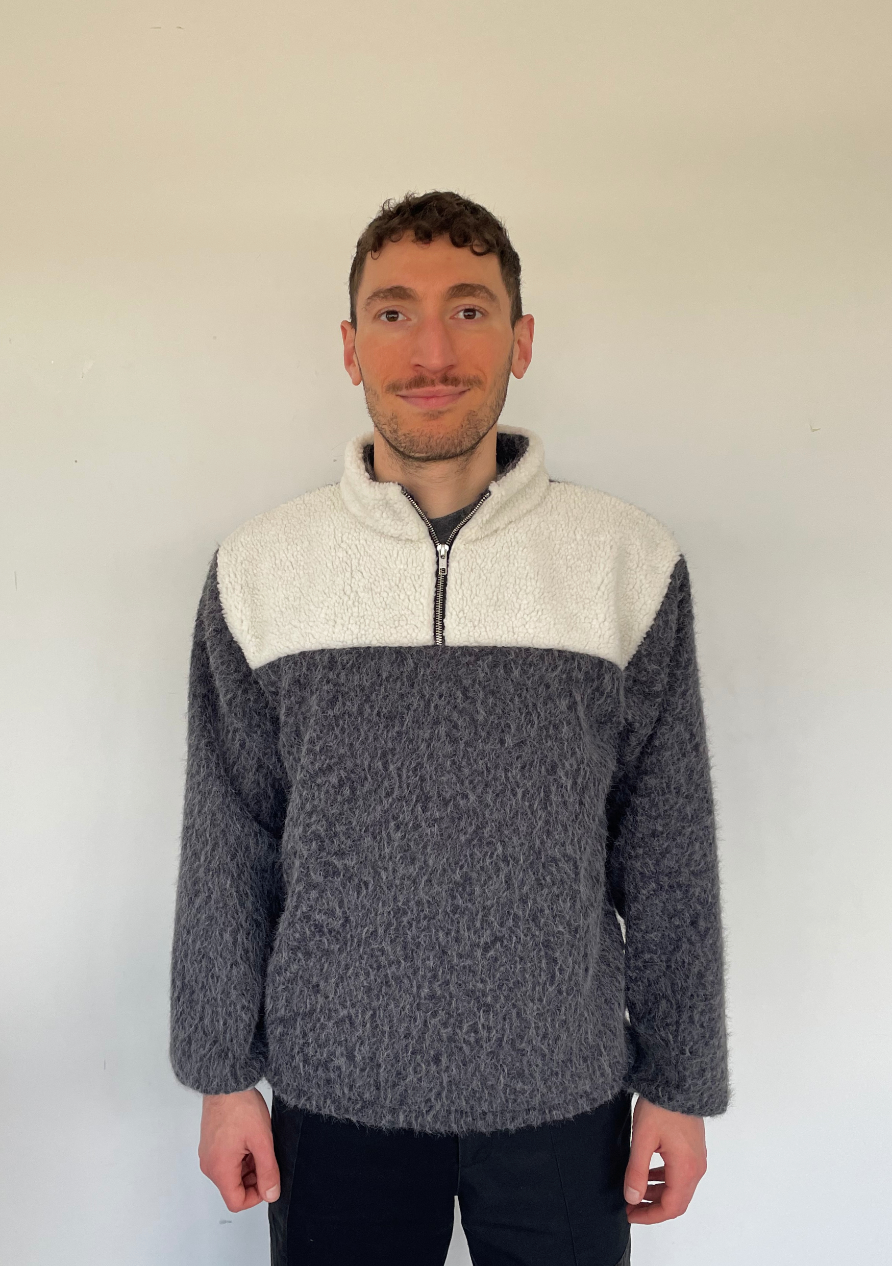 Polaire composée de sherpa (faux mouton) blanc et de lainage bouclette, parfait pour les froides journées d’hiver ! Zippée au col, bas de manches resserré par un élastique. Etiquette avec le logo de la marque cousu sur le côté de la polaire.