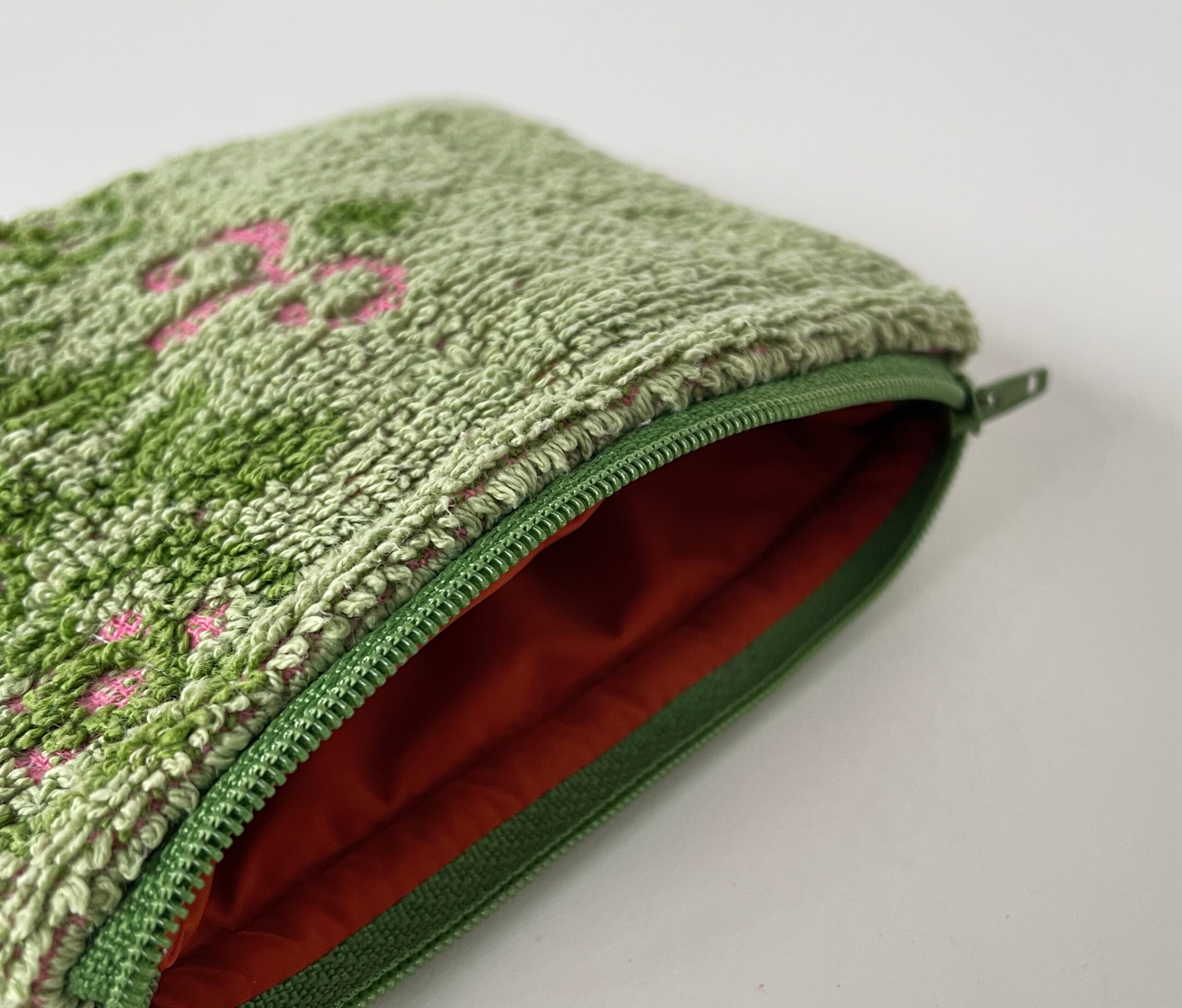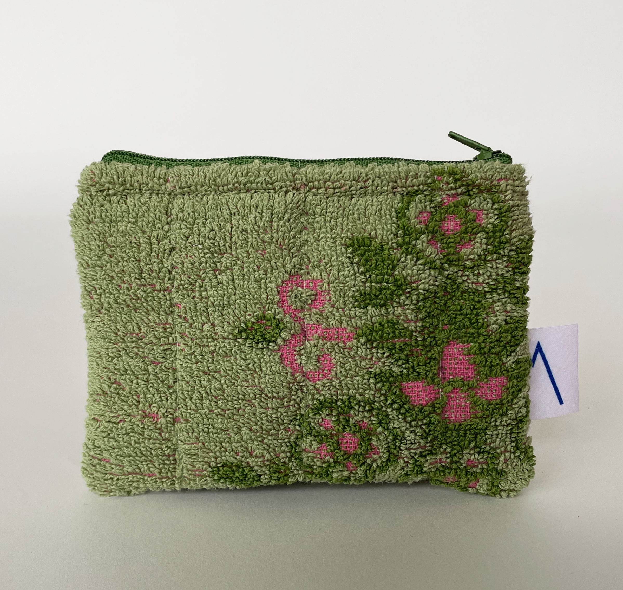 Porte-monnaie matelassé réalisé à partir d’une ancienne serviette verte, associé à un zip vert.